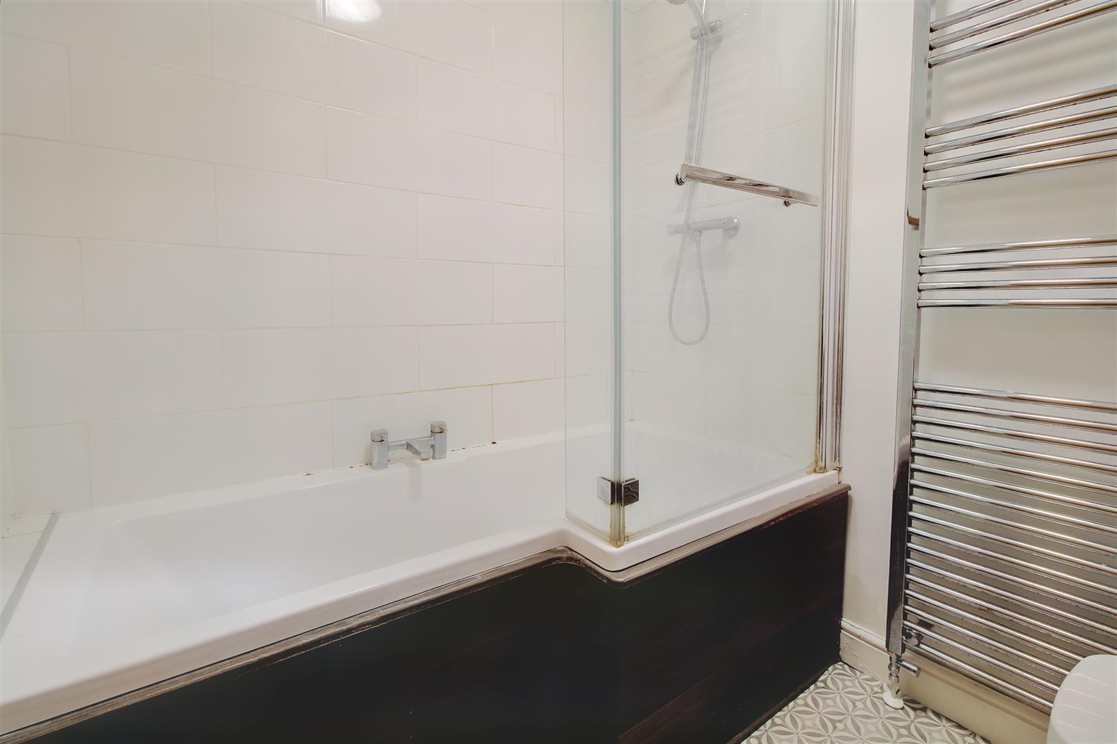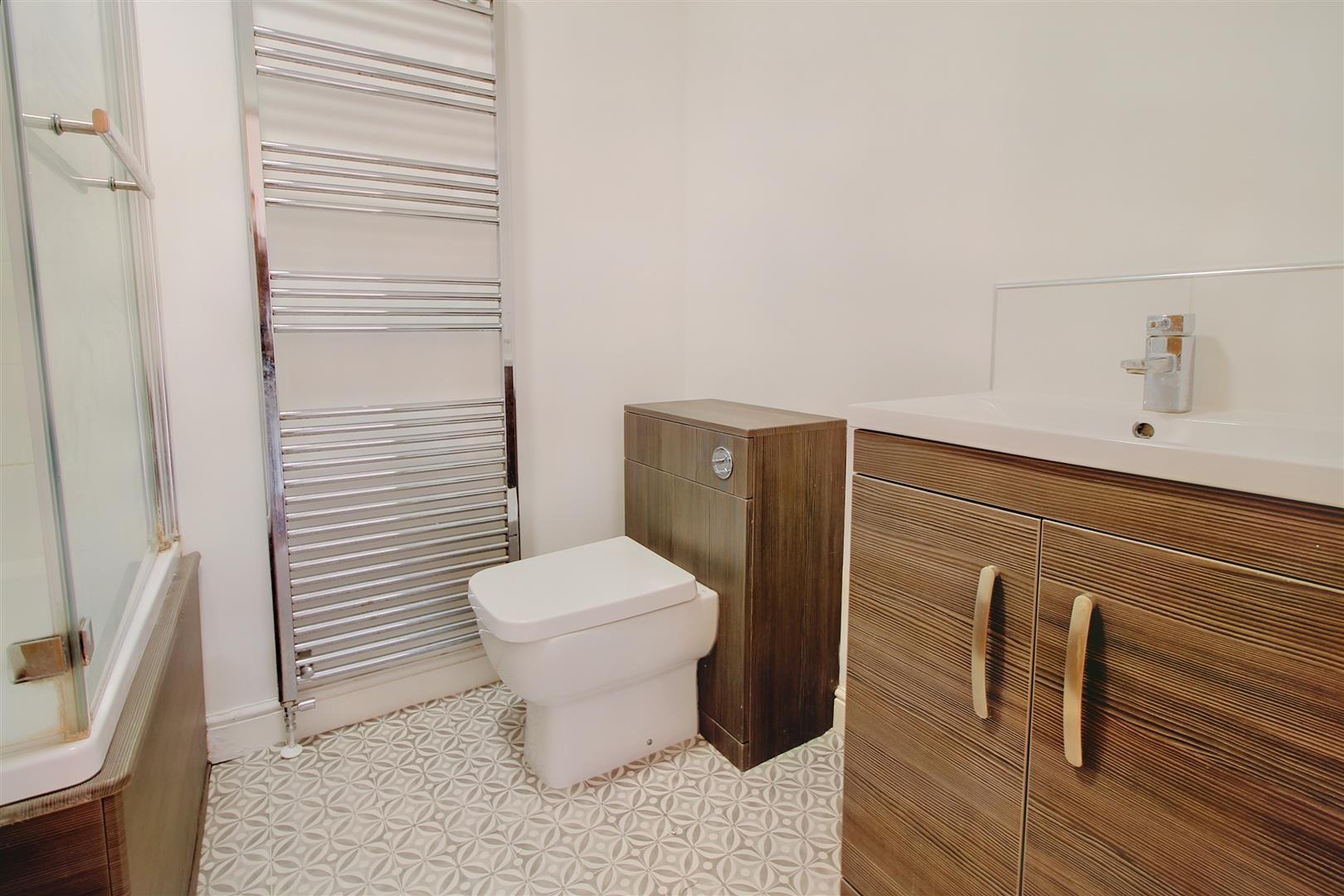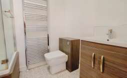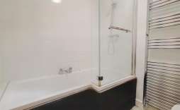 Bathroom - Panel bath with shower overhead and glass screen. Low level WC, stand alone sink basin with storage, heated towel rail and vinyl flooring.
