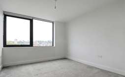 The apartment features two generously sized bedrooms, adorned with white matt emulsion paint and light grey carpeting, creating a serene atmosphere. The double-glazed aluminium windows allow for ample natural light, enhancing the overall appeal of the space. The bathroom is equally spacious, showcasing modern white sanitary ware, stainless steel fittings, and stylish tiled walls, including a striking feature wall.