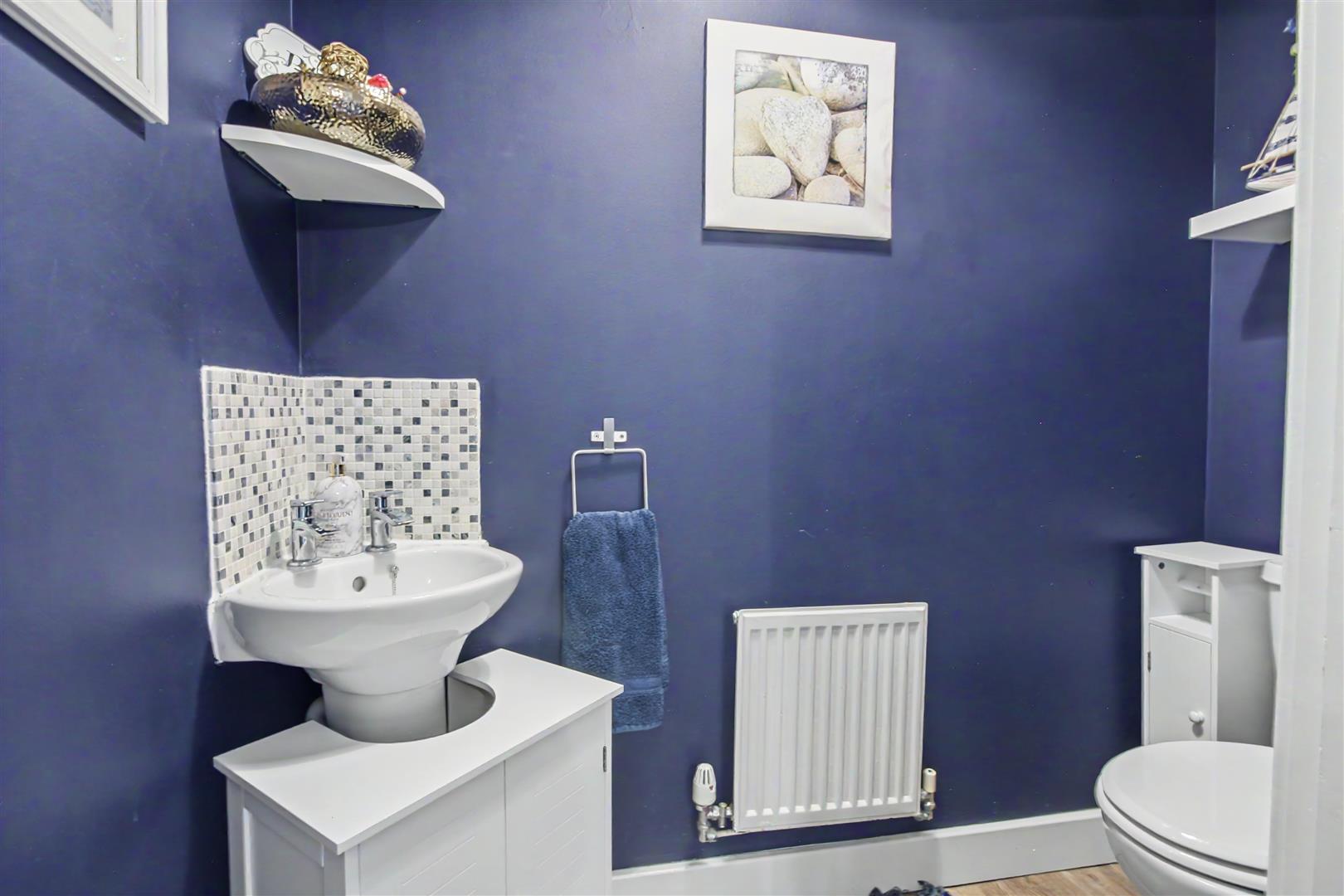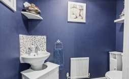 WC - 2 piece white suite offering ease for guests and family members. Painted a deep blue to compliment the suite.