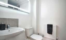 W/C - LVT flooring, WC, sink unit, radiator and coving.