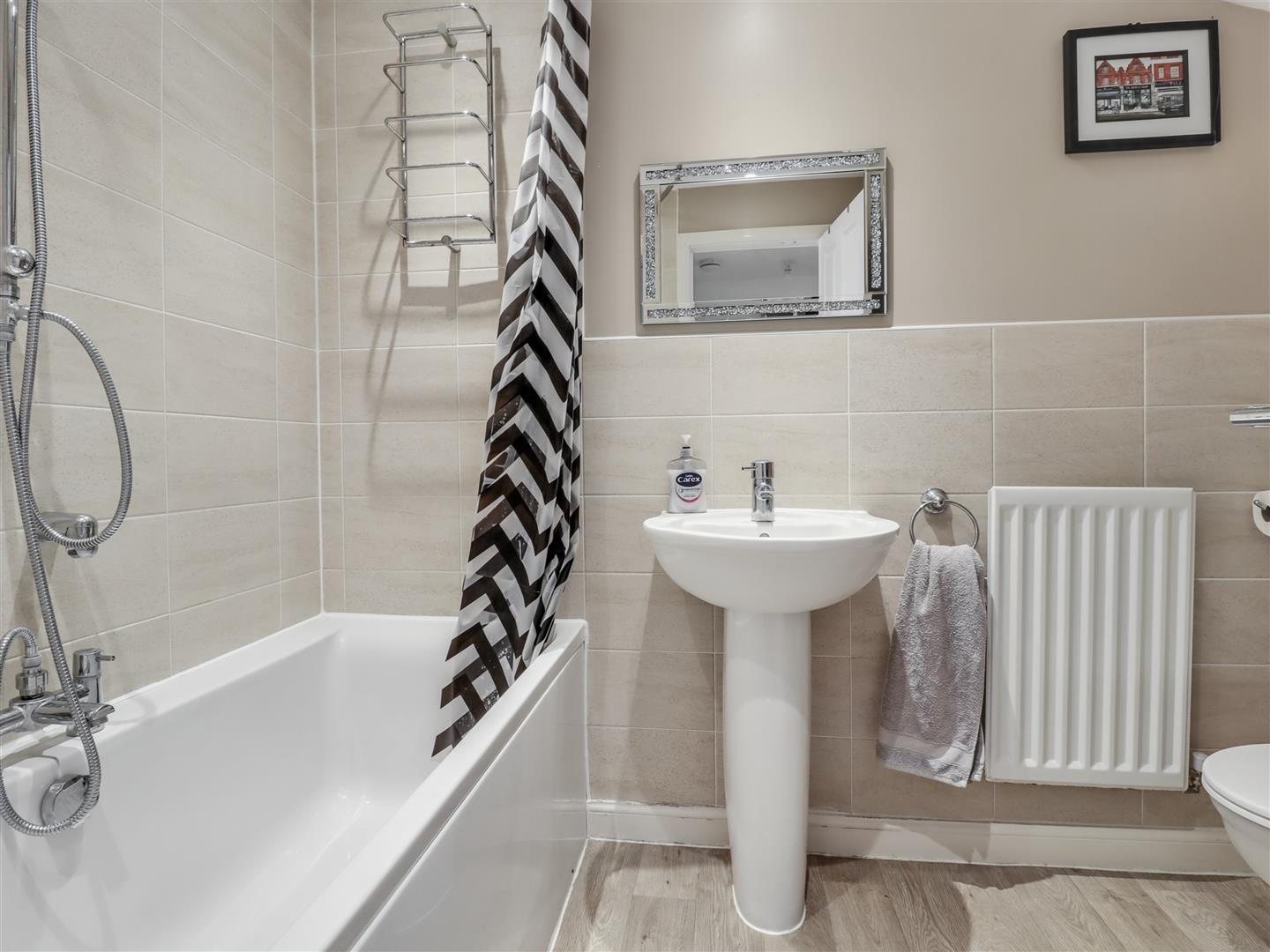 Family Bathroom - Panel bath, wc and wash hand basin, radiator, splashbacks.