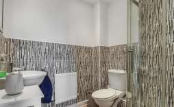 Ensuite - Corner shower cubicle, wc and wash hand basin, radiator and splash backs.