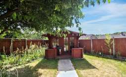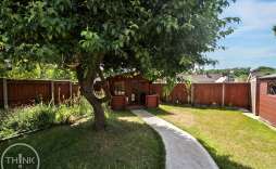 Mainly laid to lawn with paved seating terrace, timber framed summer house, x2 timber framed storage shed, timber fencing, gated access to the side, range of mature, plants, trees and shrubs