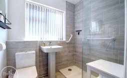 En Suite - Tiled flooring, part tiled walls, shower cubicle, vanity sink unit with storage, low level W.C, heated towel rail, obscured double glazed window to rear, spotlights.