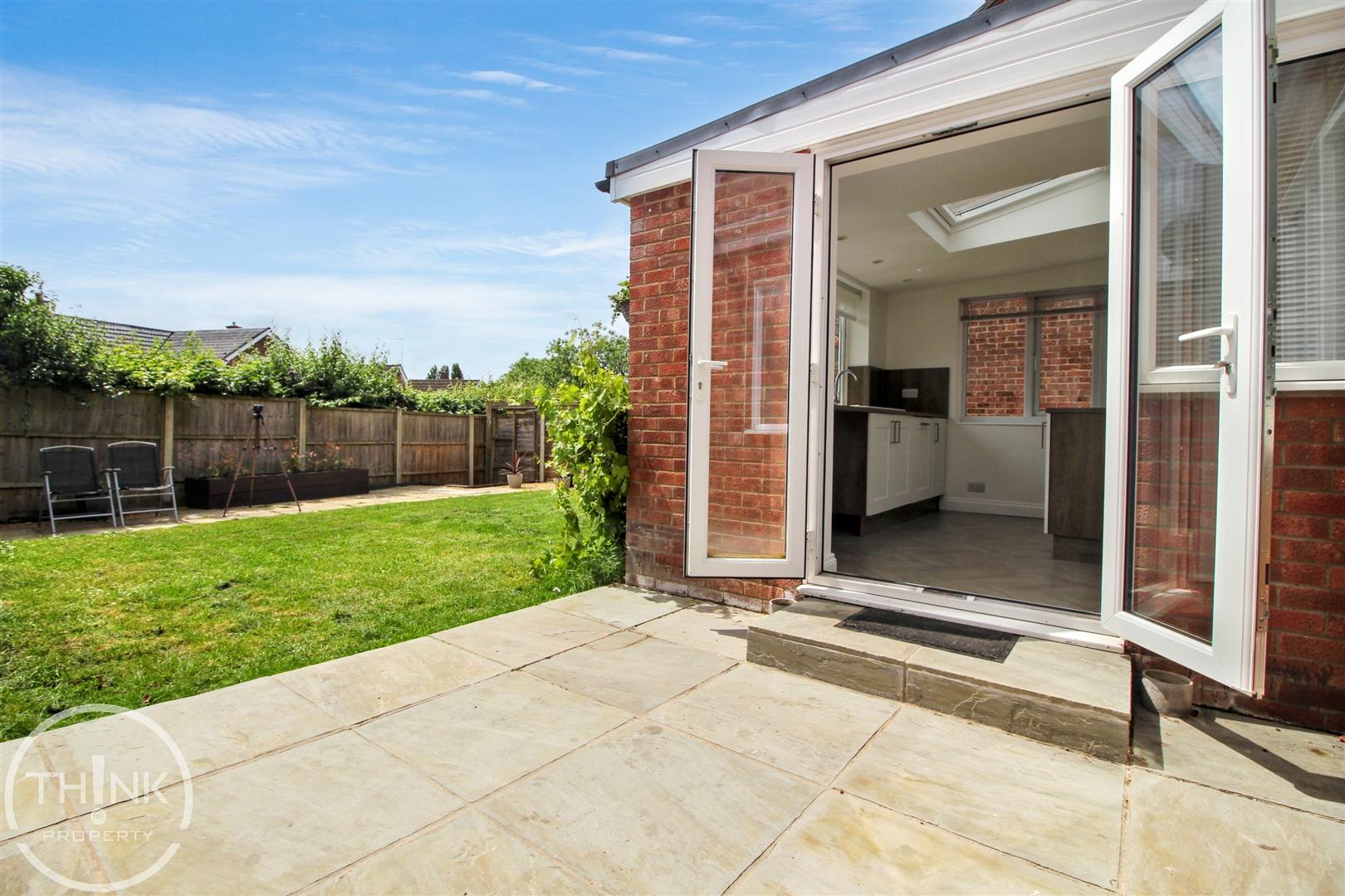 The south facing rear garden offers a peaceful retreat, primarily laid to lawn with a paved seating terrace, ideal for enjoying sunny afternoons. Railway sleeper flower beds add a touch of character, and gated access to the rear provides added convenience.