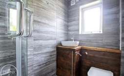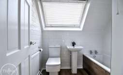 Bathroom - Laminate wood flooring, low level w/c, pedestal wash basin, panelled bath, tiled walls, radiator, velux window to rear.