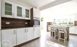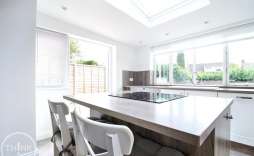 Kitchen/dining room - 5.70 x 3.31 max (18'8" x 10'10" max) - Herringbone flooring, range of fitted base and wall units with work surfaces over, sink drainer unit, kitchen island with integrated electric hob and storage, integrated oven and dishwasher, plumbing and space for washing machine, space for tumble dryer, integrated fridge freezer, spotlights, double glazed window to side x2, double glazed window to rear, doors to garden, velux window.