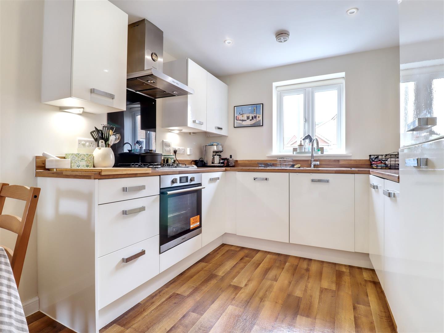 Kitchen Area - 2.69m x 2.67m (8'10 x 8'9) - Sealed unit double glazed window to the rea, range of base and wall mounted units with integrated hob, oven and extractor fan over, fridge/freezer and washing/dryer machine, sink unit and laminate flooring.