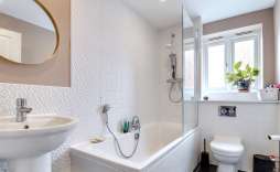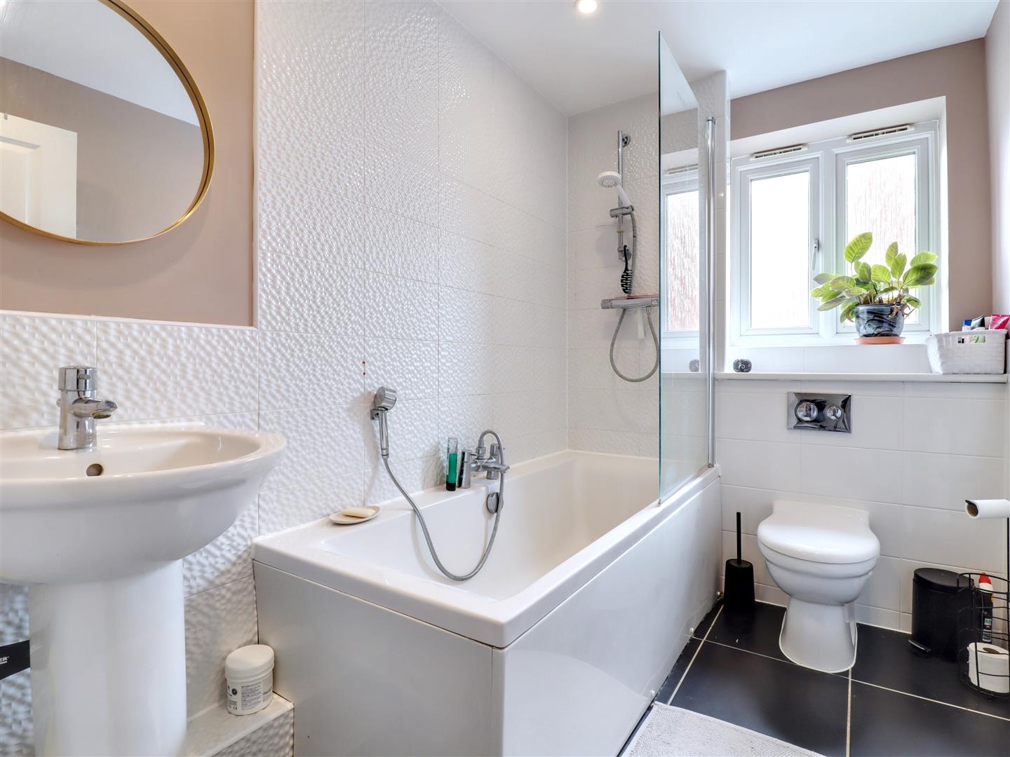 Bathroom - Sealed unit double glazed window to the front, panel bath with shower and screen, wc and wash hand basin. Splash backs and radiator.