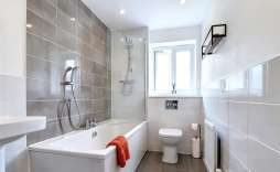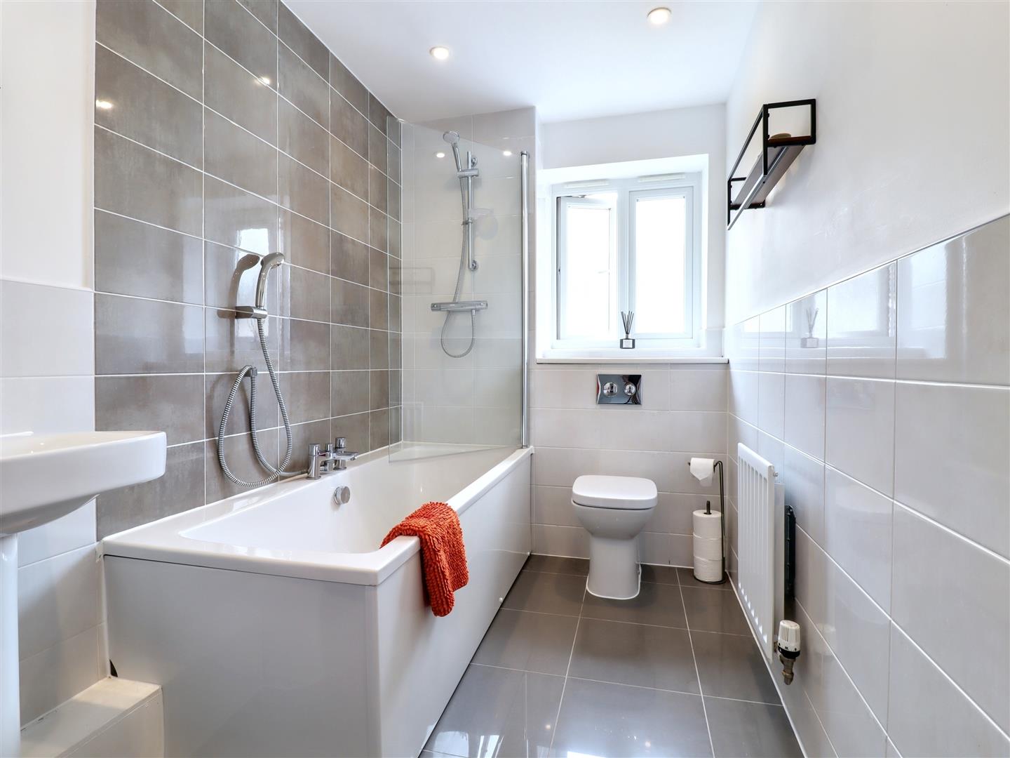 Bathroom - Sealed unit double glazed window, modern bathroom offering panel bath with shower over, partly tiled walls, wash hand basin and wc. Tiled flooring.