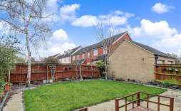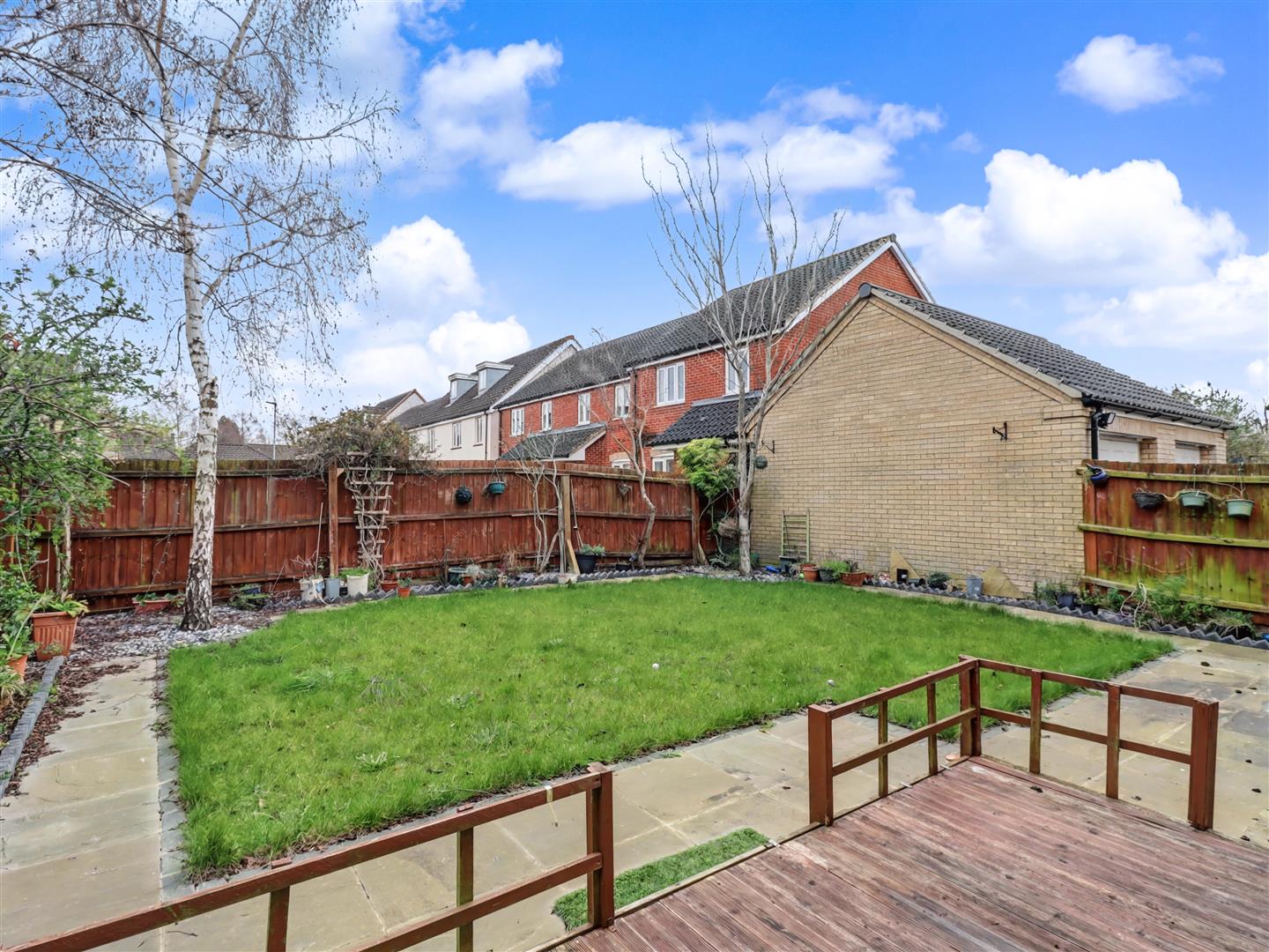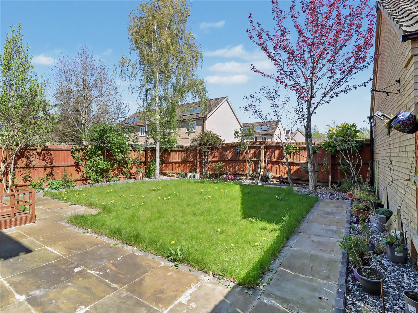 The rear garden is a delightful retreat, featuring a well-maintained lawn bordered by established flowers and shrubs. A patio area provides an ideal spot for outdoor dining or simply enjoying the tranquil surroundings. The garden also benefits from backing onto a small residential parking area, ensuring privacy and a peaceful environment.