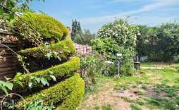 Rear garden mainly laid to lawn with patio seating area, timber fencing and a range of mature, plants, trees and shrubs.