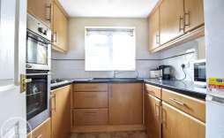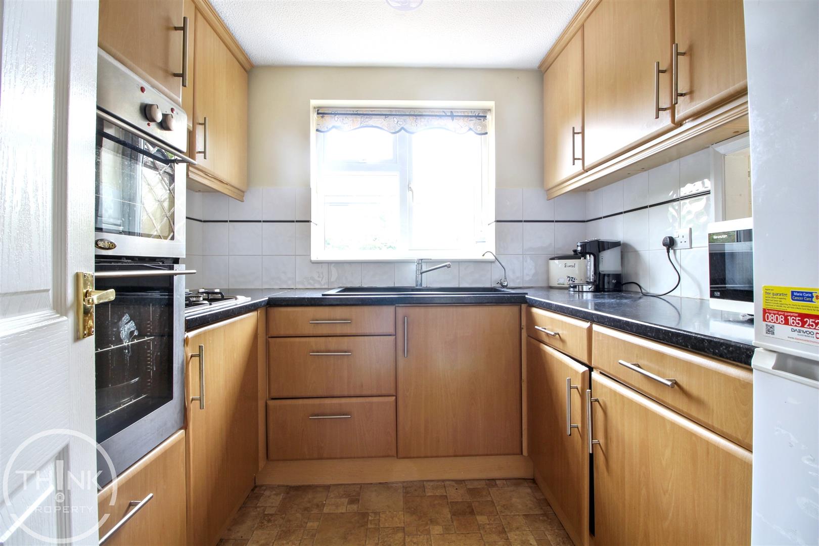 Kitchen - 2.40 x 2.39 (7'10" x 7'10") - Range of fitted base and wall units with work surfaces, integrated oven, hob and extractor, space for fridge freezer, double glazed window to rear.