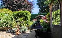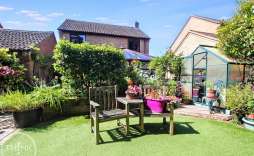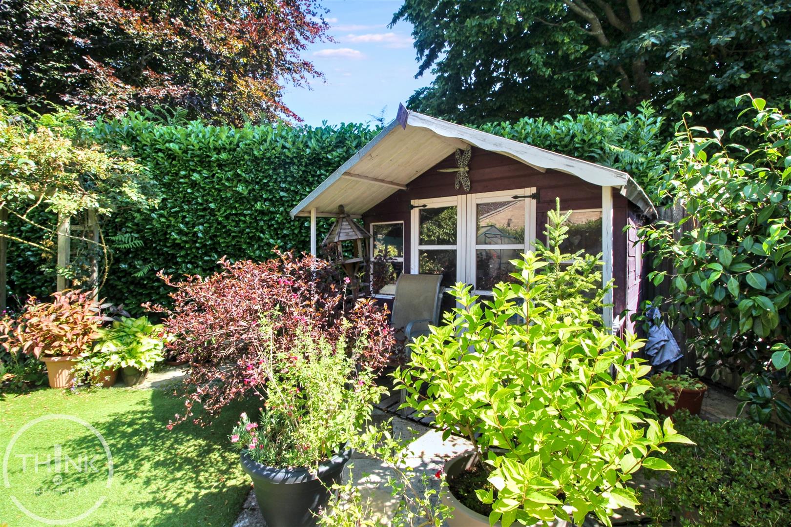 Outside - Driveway to garage, to the rear there is a private enclosed garden with paved seating terrace, artificial grass, timber framed summer house, a range of mature plants, trees and shrubs