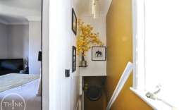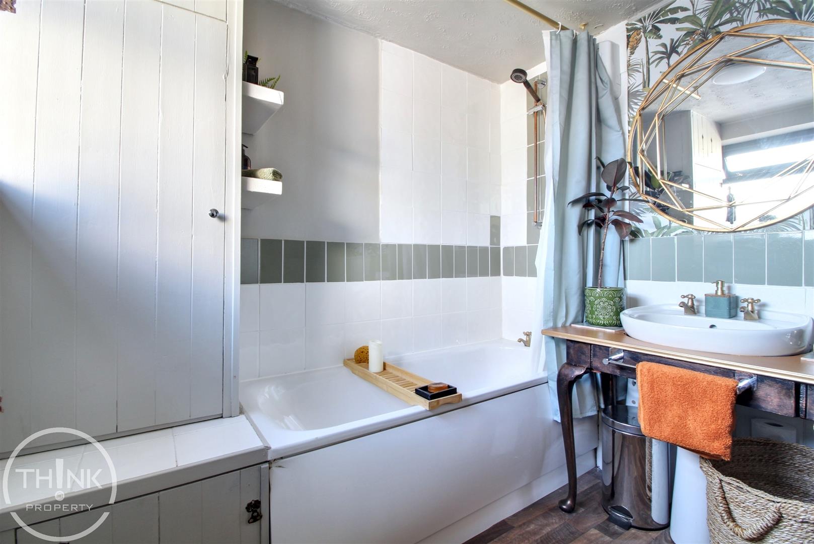 Bathroom - Tiled flooring, low level W/C, pedestal wash basin, panelled bath with shower attachment, tiled splash backs, storage cupboard, obscured double glazed window to rear.