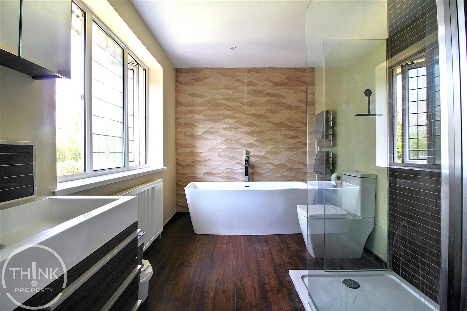 Family Bathroom - LVT flooring, free standing bath, low level W/C, shower cubicle, vanity sink unit, radiator, double glazed window to front, heated towel rail.