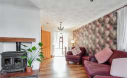 Sitting Room - 6.07m max x 5.31m max (19'11 max x 17'5 max) - Sealed unit double glazed windows to front and side. Chimney breast with inset wood burner which provides heat to radiator in the entrance hall. Door to kitchen and sealed unit double glazed double doors to garden room.