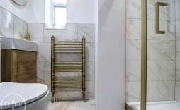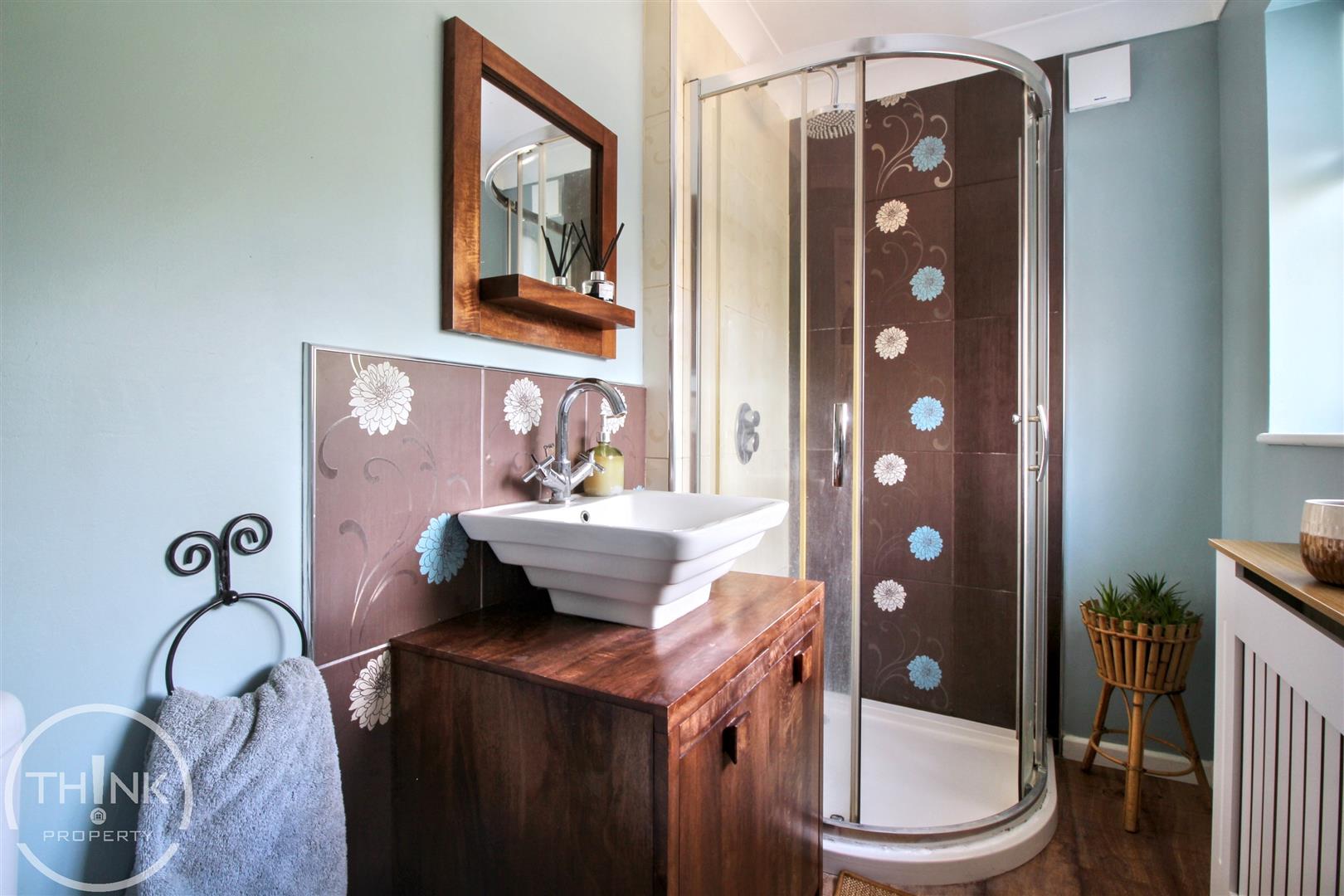 En Suite - Tiled flooring, low level W/C, vanity sink unit, shower cubicle with rain drop effect shower , obscured double glazed window to side, extractor.
