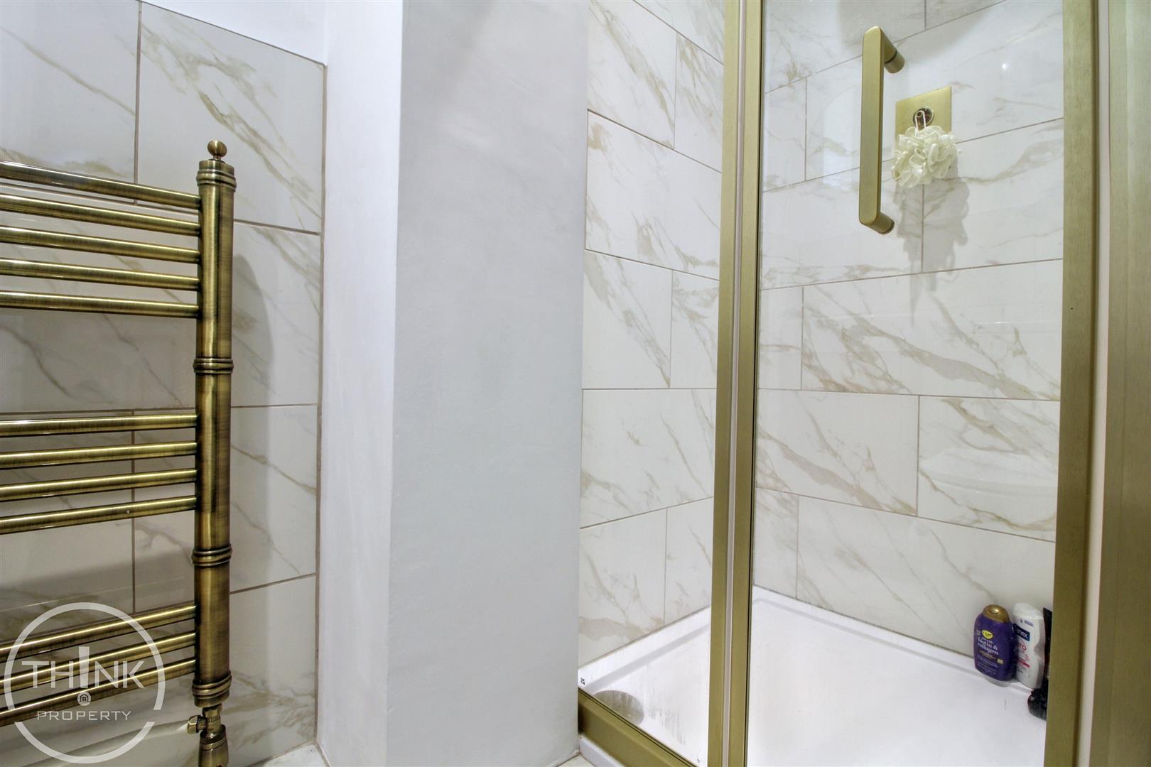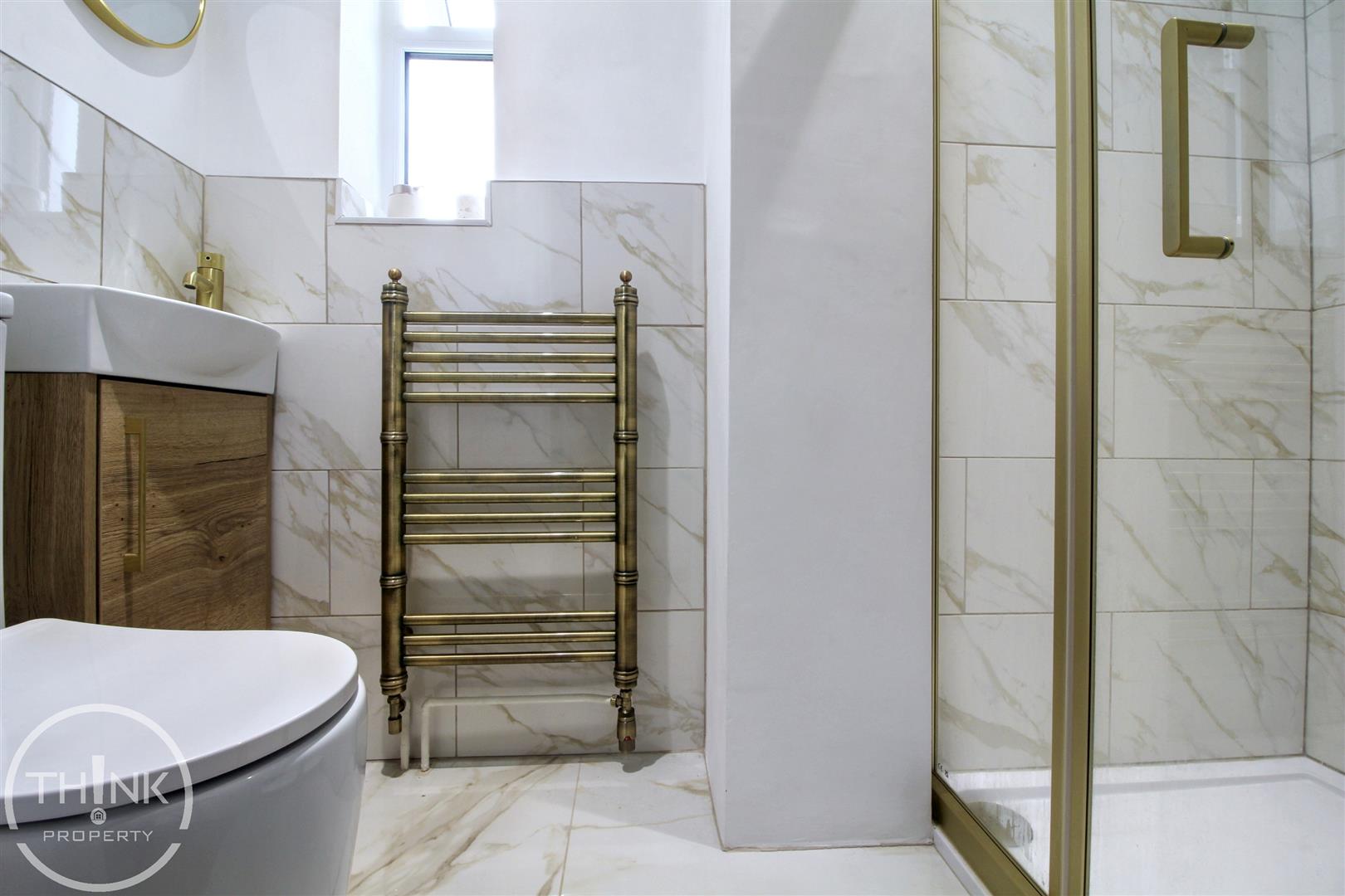 En suite - Laminate wood flooring, low level W/C, vanity sink unit with storage, shower cubicle with raindrop effect shower, radiator, obscured double glazed window to front.