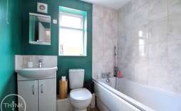 Bathroom - LVT Flooring, low level W/C, vanity sink unit, panelled bath, tiled splash backs, extractor, obscured double glazed window to side.