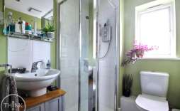 En Suite - Tiled flooring, shower cubicle, pedestal wash basin, low level W/C, heated towel rail, obscured double glazed window to side, extractor.