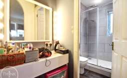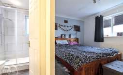 En Suite - Laminate wood flooring, low level W/C, vanity sink unit, tiled walls, shower cubicle with rain drop effect shower, heated towel rail, obscured double glazed window to side.
