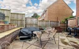 The rear garden is tiered to include a paved seating terrace with steps leading up to the lawned gardens with timber fencing and a range of plants, trees and shrubs.