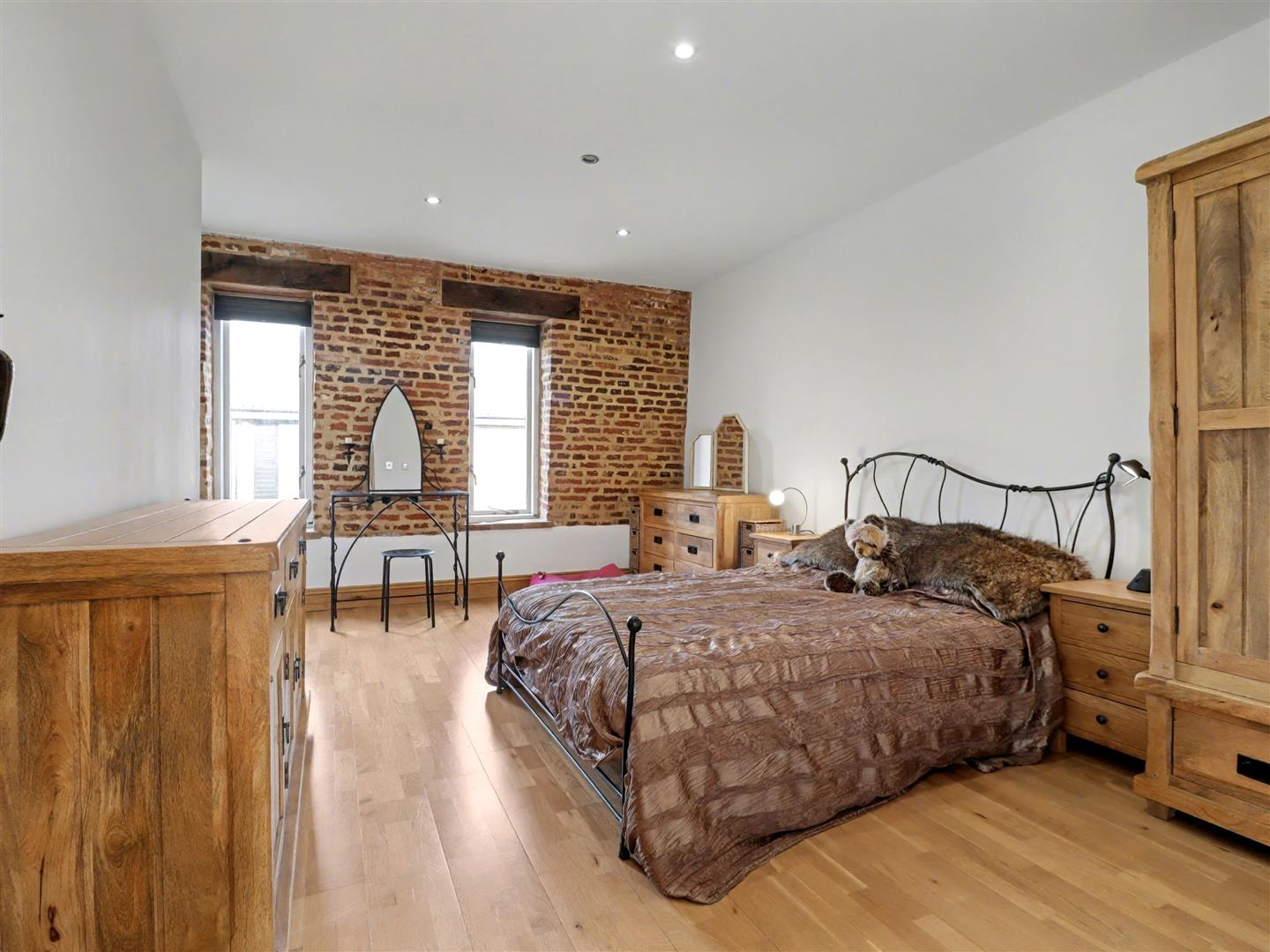 Bedroom Three - 4.85m x 3.61m (15'11 x 11'10) - Sealed unit double-glazed windows to the side fill the room with natural light, while a radiator provides warmth. Exposed brickwork on the end wall adds character and a touch of rustic charm.