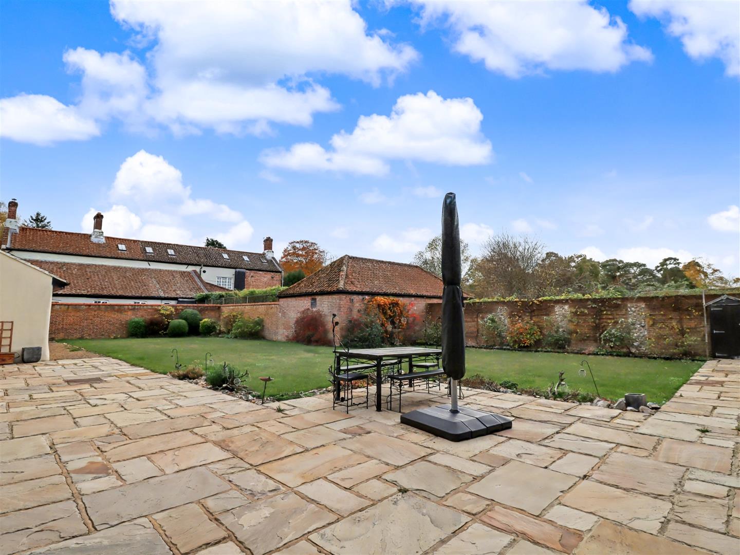 The gated courtyard is both practical and versatile, providing access to the integral annexe cart lodge. At the rear, the main garden offers a private and tranquil setting, predominantly laid to lawn and enclosed by shrubs and flowering borders. A feature Yorkstone patio provides an ideal space for outdoor entertaining and leads around to a further courtyard and the annexe, seamlessly connecting the various outdoor areas of this special home.
