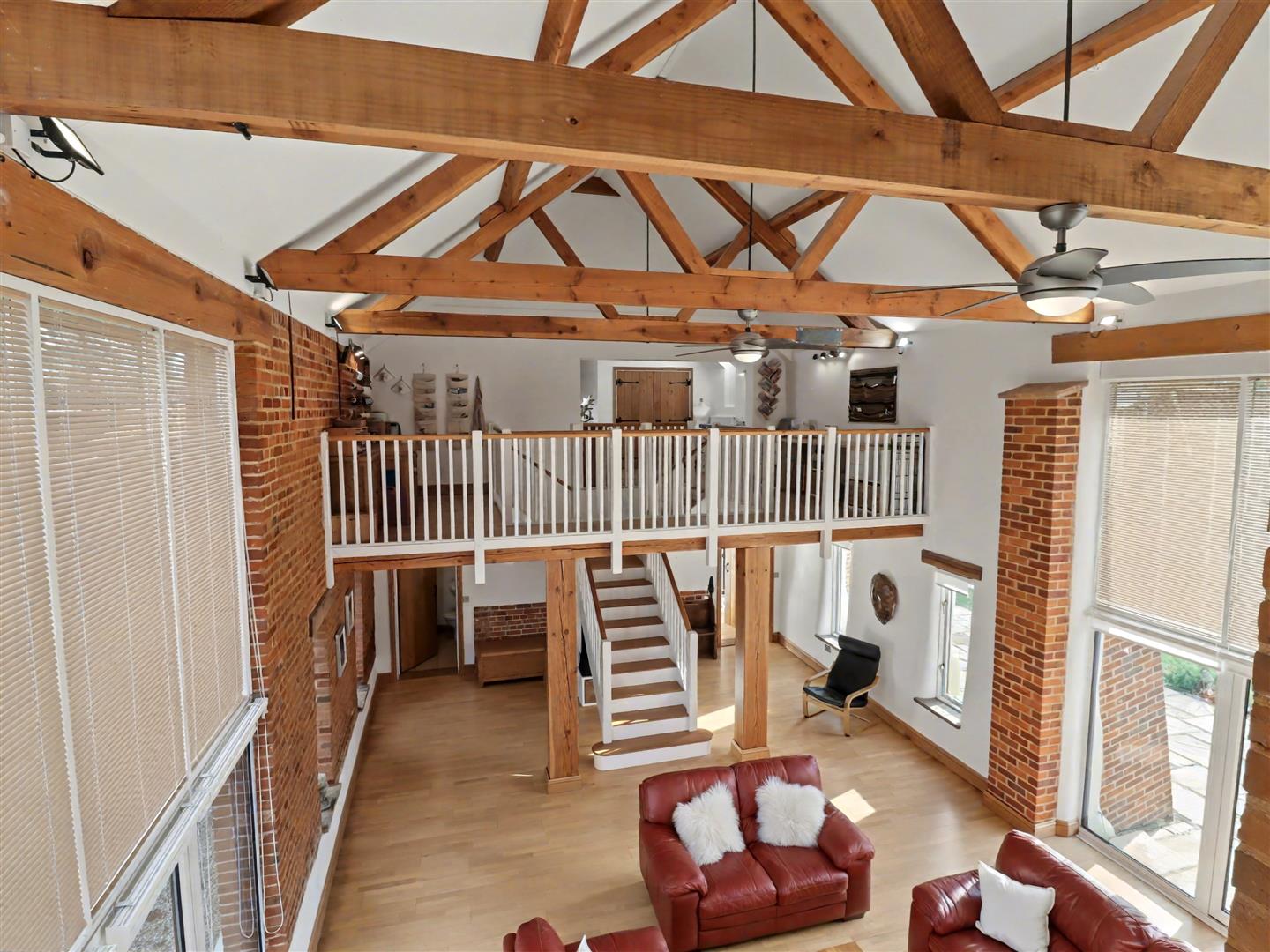 Drawing/Sitting Room - 15.54m x 6.35m inc above (51'0 x 20'10 inc above) - Full-height sealed unit double-glazed windows with double opening doors lead out to the rear garden, mirrored on the opposite side to create a beautifully balanced and light-filled space. This stunning room is vaulted upwards into a magnificent display of exposed beamed roof framework. The central staircase rises to the galleried landing, where the exposed chimney breast and working wood burner form a striking focal point. The matching flooring continues throughout, with a door leading through to the inner hall.