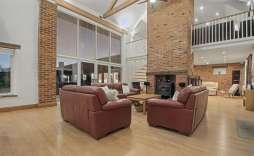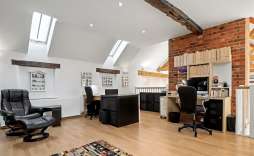 Family Room - The family room, leading directly from the kitchen/breakfast/dining room, is a fantastic bright and spacious family area that still manages to feel wonderfully cosy. Sealed unit double-glazed windows to the side allow natural light to pour in, while a central feature fireplace, areas of exposed brickwork, and wood-style flooring add warmth and character. A spiral staircase rises to the mezzanine study/library, enhanced by a ceiling beam and vaulted opening through to the sitting/drawing room, creating an impressive sense of height and flow.