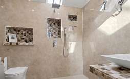 Ensuite Bathroom - A sealed unit double-glazed window to the side brightens the room, which features a shower cubicle, panel bath, WC, and wash hand basin. Travertine splashbacks and a tiled floor add a stylish and durable finish.