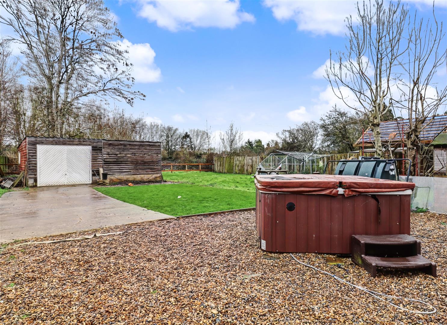 Outside - The front of the property is screened from the lane with slatted fencing with carriage driveway and further parking to the side. Gated access to the rear garden which is mainly laid to lawn with detached garage and undercover seating area, fairly unoverlooked and plenty of space to catch the sunshine for the summer ahead.