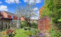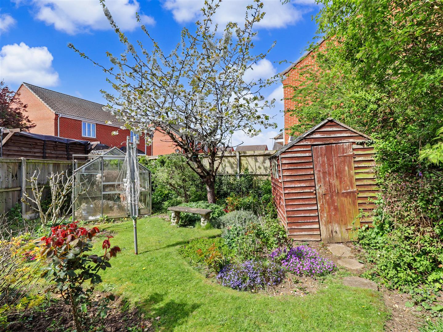 The rear garden is a true highlight, having been lovingly landscaped by the current owner. With sculptured borders that promise seasonal surprises, this garden is a haven for nature lovers. The lawned area provides a serene setting, while an additional seating space at the rear, complete with a fruit tree and a shed, offers a perfect spot for outdoor enjoyment.