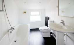 Bathroom - 2.7 x 1.8 (8'10" x 5'10") - UPVC double glazed window to the rear aspect, low level WC, stand alone sink basin, panel bath with shower and vinyl flooring.
